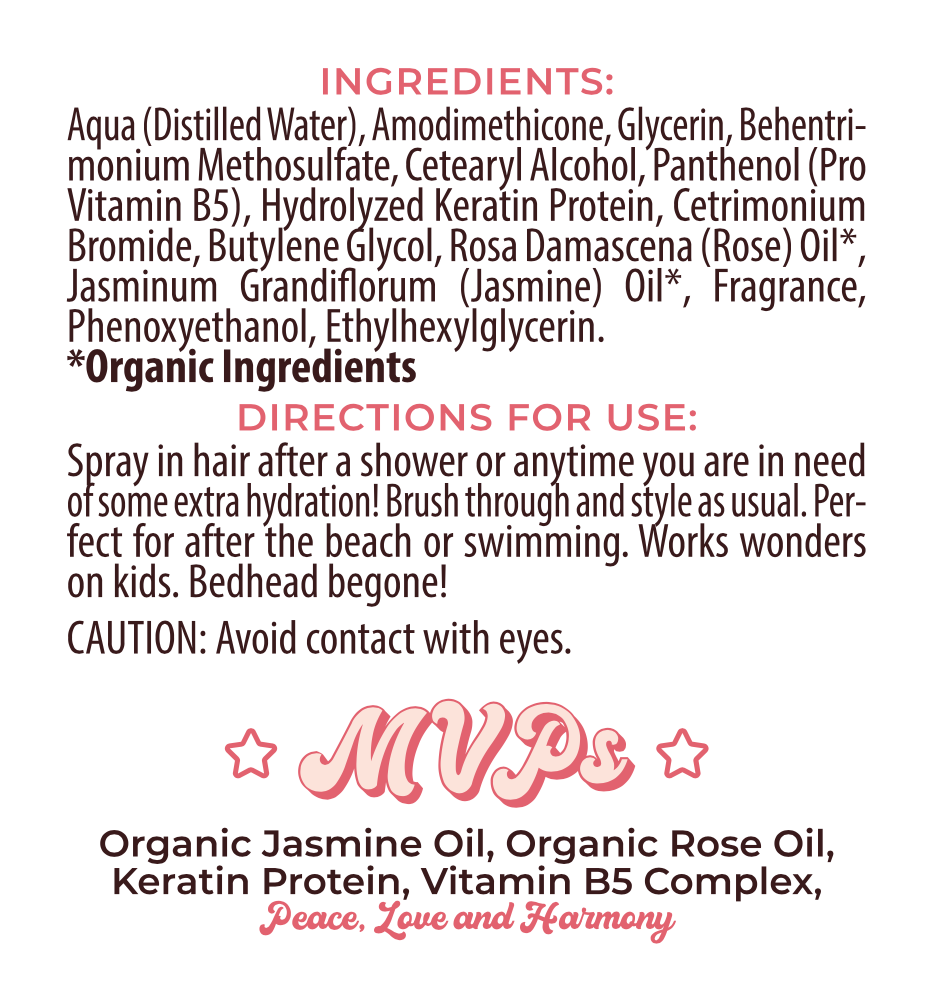 Spray in hair after a shower or anytime you are in need of some extra hydration! Brush through and style as usual. Perfect for after the beach or swimming. Works wonders on kids. Bedhead begone!